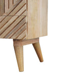 Add this unique Lille solid wood media unit to your living room, constructed from 100% solid mango wood in an oak-ish finish, this piece features 2 open slots and a very unique carved design on the drawer fronts with a clean finish meaning easy access into the drawers without any knobs. It features 4 Nordic-style legs which complement the body nicely and gives the entire piece a contemporary look. The perfect addition to the home.