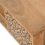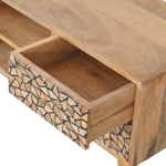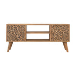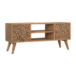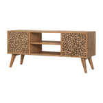 This media unit has been constructed from 100% solid mango wood in an oak-ish finish. It has Wood Resin Inlay 2 drawers and 2 open slots for storage convenience and features Nordic style legs with shiny knobs which give a lovely contrast against the print. More items are available from the Lisbon range.