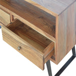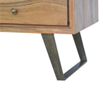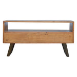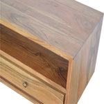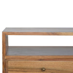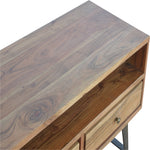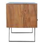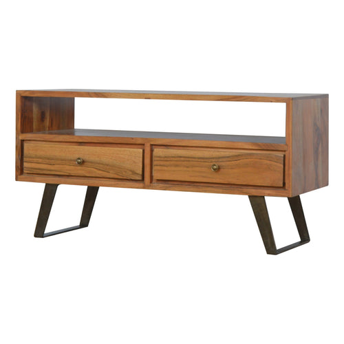 This media unit has a clean and simple design to suit most homes. This piece has a lovely caramel finish and features 1 large open slot and 2 drawers to store bits and pieces. It has been constructed from 100% solid Acacia wood and has an industrial Pewter base. It can stand alone or be partnered with the other pieces from the range.