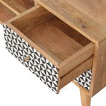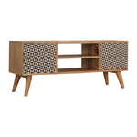 As part of our Rafina range, this media unit has been constructed from 100% solid mango wood in an oak-ish finish. It has 2 drawers and 2 open slots for storage convenience and features nordic style legs with shiny knobs which give a lovely contrast against the print. More items are available from the Rafina range.