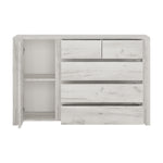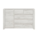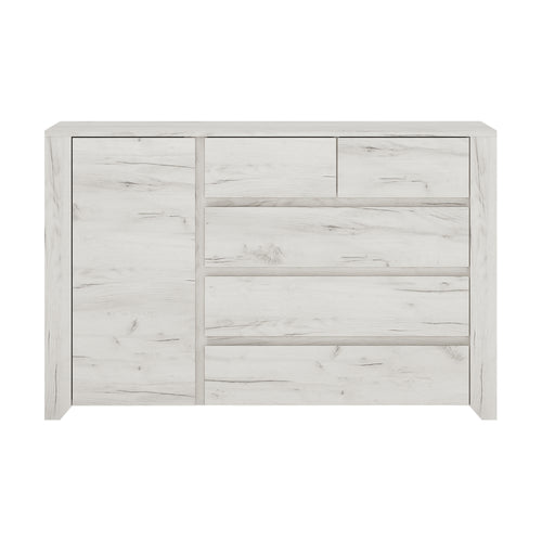 1 Door 2+3 drawer Chest. This beautifull bedroom collection is contemporay and stylish and suitable for all age groups, finished in a modern hard wearing white crafted Oak melamine. This compact 119cm wide chest has lots of storage with 2 small over 3 wide drawers and cupboard with interior shelf.