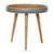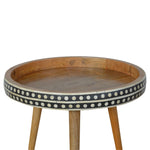 This solid wood end table has made from 100% mango wood in a fine oak-ish finish. The no-fuss finish reveals the beautiful grain of the mango wood which this piece of furniture is made of. This tripod table stands on Nordic style legs and features a black and white bone inlay pattern on the edges. The bone is sourced responsibly from deceased animals such as camels, goats, and buffaloes.