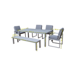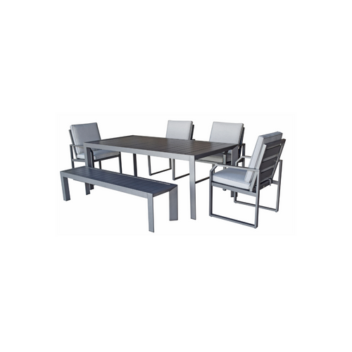 The Maja outdoor dining set is an aluminium dining set with a bench & 4 chairs in a grey powder coat finish.