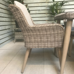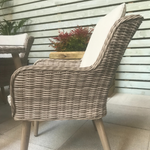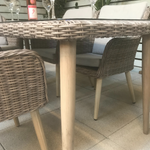 Care Instructions: Cushion covers are showerproof but need to be stood on their ends for water to drain away. All cushions should be stored away in a dry area when not in use. Cushion covers can be cleaned with soapy water and damp cloth that is not abrasive. We do not advise washing or tumble drying as this may affect the showerproof properties. Do not leave any glass items/objects on the table without mats/coasters. Do not store glass on its end during assembly; please place it on a flat surface on the carton provided. Cover glass in extreme heat as this can magnify the heat and melt wicker.