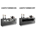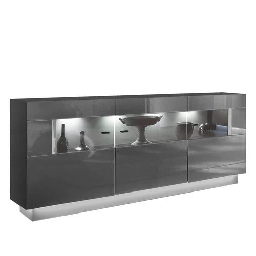 The Denira display sideboard is a stunning choice for bringing high-gloss style to your home. This piece features three partially glassed hinged doors with a total of nine compartments behind, meaning that it is perfect both for keeping ornaments or for storing everyday essentials. The cabinet is finished in the captivating graphite gloss, giving it a touch of class that will enhance any living space.