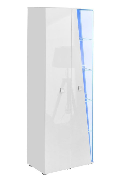 This stunning display cabinet is crafted from the finest materials and offers a versatile design. Boasting a premium gloss finish, it is perfect for showcasing any essential or decorative items you want to keep safe and organized. It features two hinged doors, one partially-glazed, with blue LED lighting for a touch of glamour.
