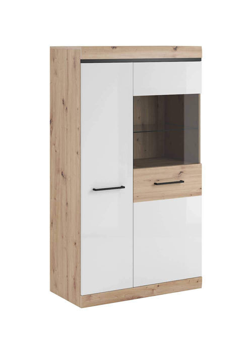 Stylish, functional and built to last, this eye-catching sideboard is a perfect addition to any modern or contemporary room. With glossy white finish, it impresses with its high-quality craftsmanship, eight shelves (one glass), and two hinged doors one of which is partially-glazed. Crafted from 16mm laminated board and finished in the timeless Oak Artisan with white gloss, it will effortlessly blend into any home decor.