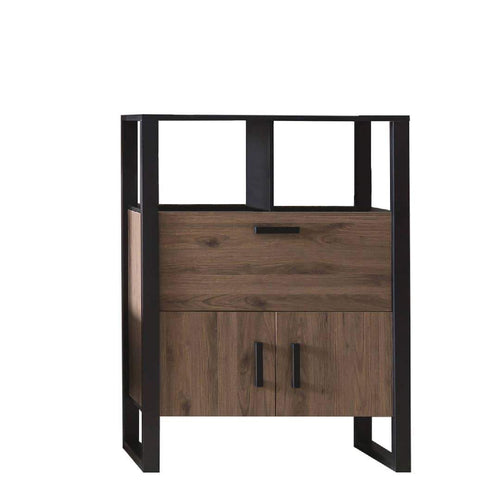 The Nordi 34 is a modestly sized sideboard cabinet that features three hinged doors and two open compartments. The doors are finished in a beautiful combination of timeless oak and elegant black matt, which will effortlessly blend in any decor. This piece is perfect for use in a living room, hallway or dining room.