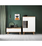 This modestly-sized TV cabinet impresses with its versatile design, boasting clean lines and an open, airy construction. It is built from 16mm laminated chipboard with Oak Riviera and white matt. It will work great as a TV cabinet in your living room as well the bedroom.