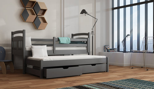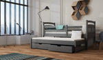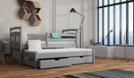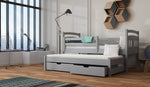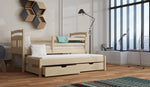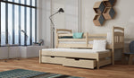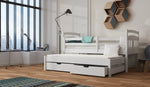 The Feliks wooden bed is made from premium quality pinewood and painted in a health-friendly, three-layered water-based paint. It includes a trundle with two storage drawers underneath it for bedding and other items. The primary bed is equipped with a removable guard at the front, making it possible to convert it into a cot for infants and toddlers. This bed can be bought with or without a mattress; choices include foam and open coil spring mattresses.