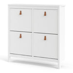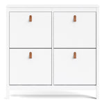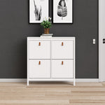 A modern shoe cabinet with four storage compartments in a striking design complete with brown leather tab handles, also available in contrasting matt black