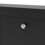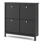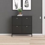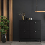 A modern shoe cabinet with four storage compartments in a striking design complete with a simple metal handle, also available in white