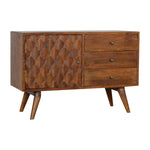 Enjoy this sideboard in your bedroom or living room, constructed from 100% solid wood in a chestnut finish, it features 4 Nordic style legs with 3 deep drawers and 1 cabinet to take care of everyday utility items. The main feature of this product is the raised carved door front which adds a nice touch to the product and will add lasting character to your home.