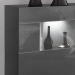The Denira display sideboard is a stunning choice for bringing high-gloss style to your home. This piece features three partially glassed hinged doors with a total of nine compartments behind, meaning that it is perfect both for keeping ornaments or for storing everyday essentials. The cabinet is finished in the captivating graphite gloss, giving it a touch of class that will enhance any living space.