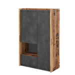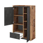 The Fargo sideboard cabinet is a rustic yet stylish storage cabinet. Finished in the vintage Alpine Spruce with raw concrete colour, it is retro-industrial in design with its antique style of metal handles. There are two hinged doors with numerous shelves, open storage compartment that can be used for any number of purposes including decorative items or bottles of wine, and one drawer.