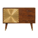This Manila Sideboard was designed to add a touch of elegance and charm to your home. It features a brass plated cabinet and 3 drawers along with Nordic-style brass cap feet, it has been constructed from 100% solid mango wood in a rich chestnut finish and pull-out handles along with surface space on top to uplift your living room or hallway.