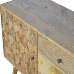 Add this sideboard to your living room, or bedroom. Standing on 4 Nordic style legs it features 1 large cabinet door and 3 drawers which each have 1 shiny knob. This is a very stylish and versatile piece that features a hand-carved pineapple design on the wood which can match any style of interior and could go nicely with a variety of different colours and finishes. This piece can stand alone or can be completed with the matching collection which includes a writing desk, cabinet, chest, and bedside table.