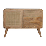 This stylish Nordic Rattan sideboard combines a woven door front with a smooth oak-ish finish body and legs. Constructed from 100% solid mango legs it features 3 spacious drawers perfect for storage, a shiny knob on the drawers, and nordic style legs. Make full use of this cabinet in the living room and partner it with the rest of the collection.