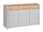 This elegant and practical sideboard cabinet is the ideal storage solution for your living and dining room. It features a trio of drawers and a large compartmental space behind the three hinged doors. Finished in the timeless Oak Riviera and elegant Pearl Grey, it will blend effortlessly with other furniture in your home.