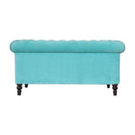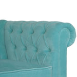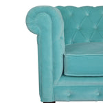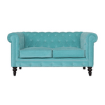 This beautiful 2 Seater Chesterfield Sofa has been upholstered in a luxurious smooth aqua cotton velvet. It features 4 turned feet constructed from 100% solid mango wood in a walnut...