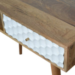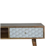 This stunning writing desk has been constructed from 100% solid mango wood in an oak-ish finish with unique white honeycomb hand carved drawer fronts. It features 4 Nordic style legs,...