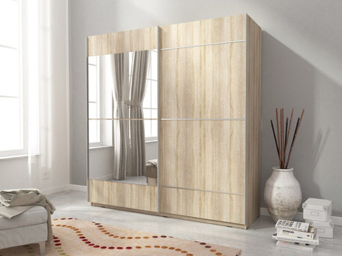 A modern and functional wardrobe with two sliding doors, one mirrored, and the other marked by decorative linings. The Mika 04 is available in two different colours – Oak Sonoma...