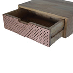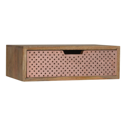 This wall-mounted bedside has been constructed from 100% solid mango wood in an oak-ish finish and features 1 copper front drawer and cut-out access for easy access to and from...